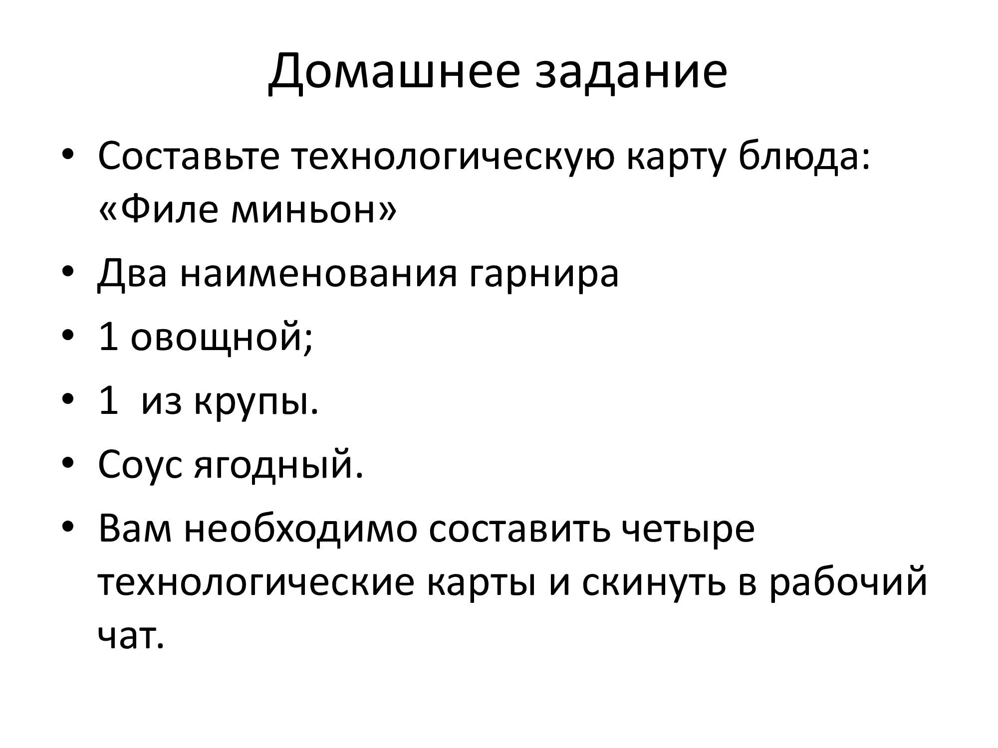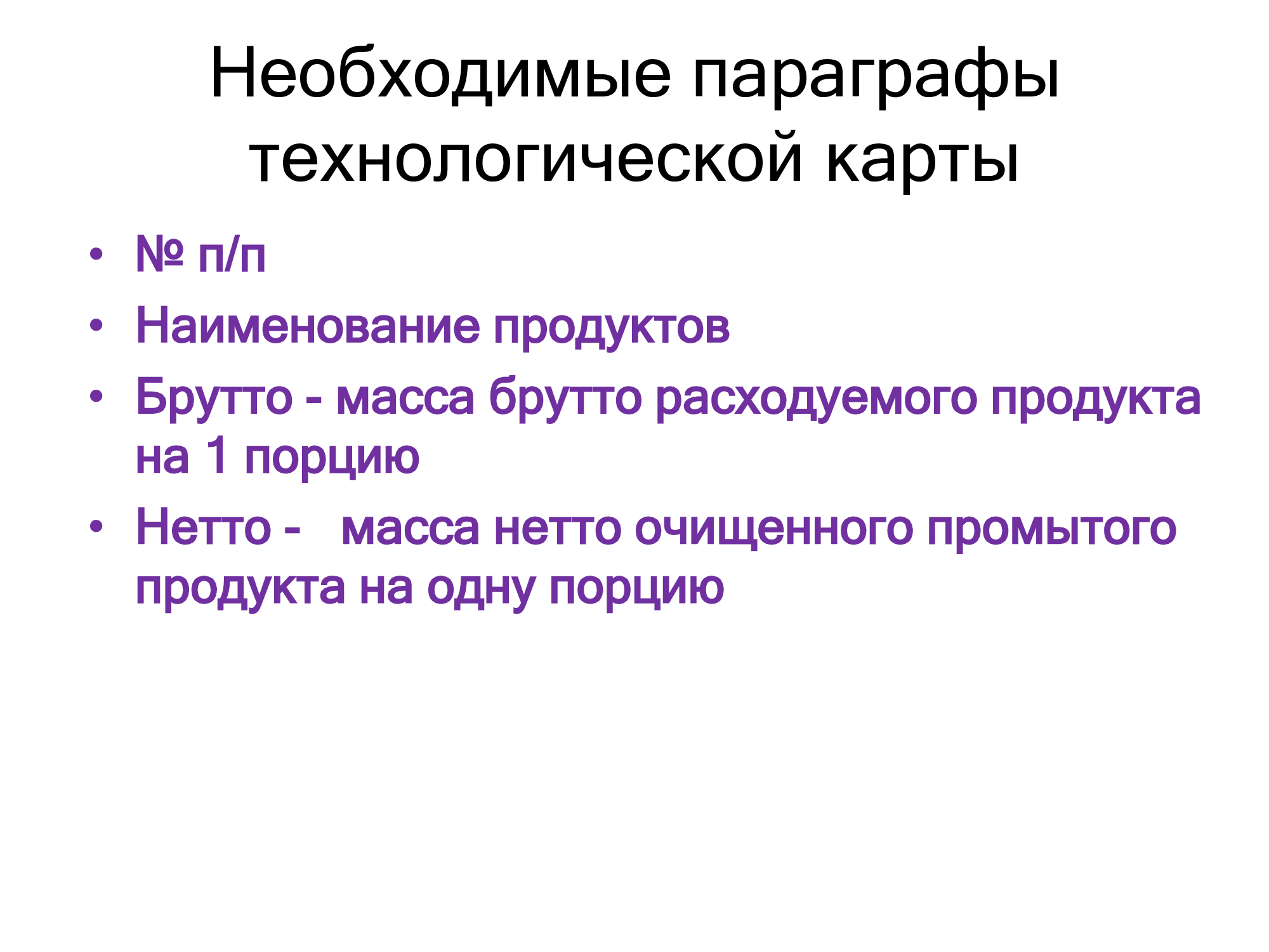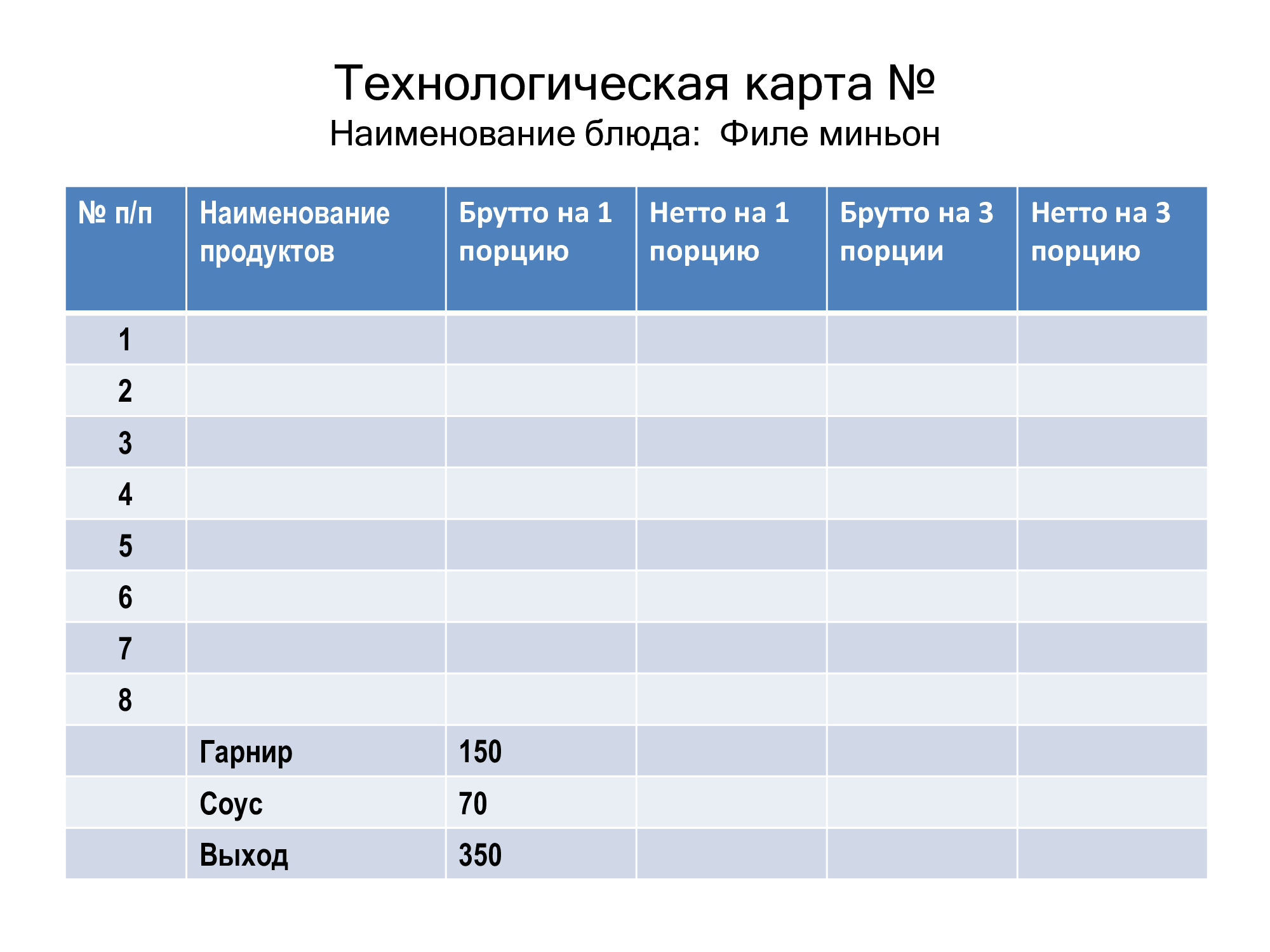 Технологиялық картада тағамның рецепті, барлық ингредиенттердің нақты сипаттамасы, пропорциялар, сондай-ақ белгілі бір тағамның дұрыс дизайны нақты көрсетіледі.