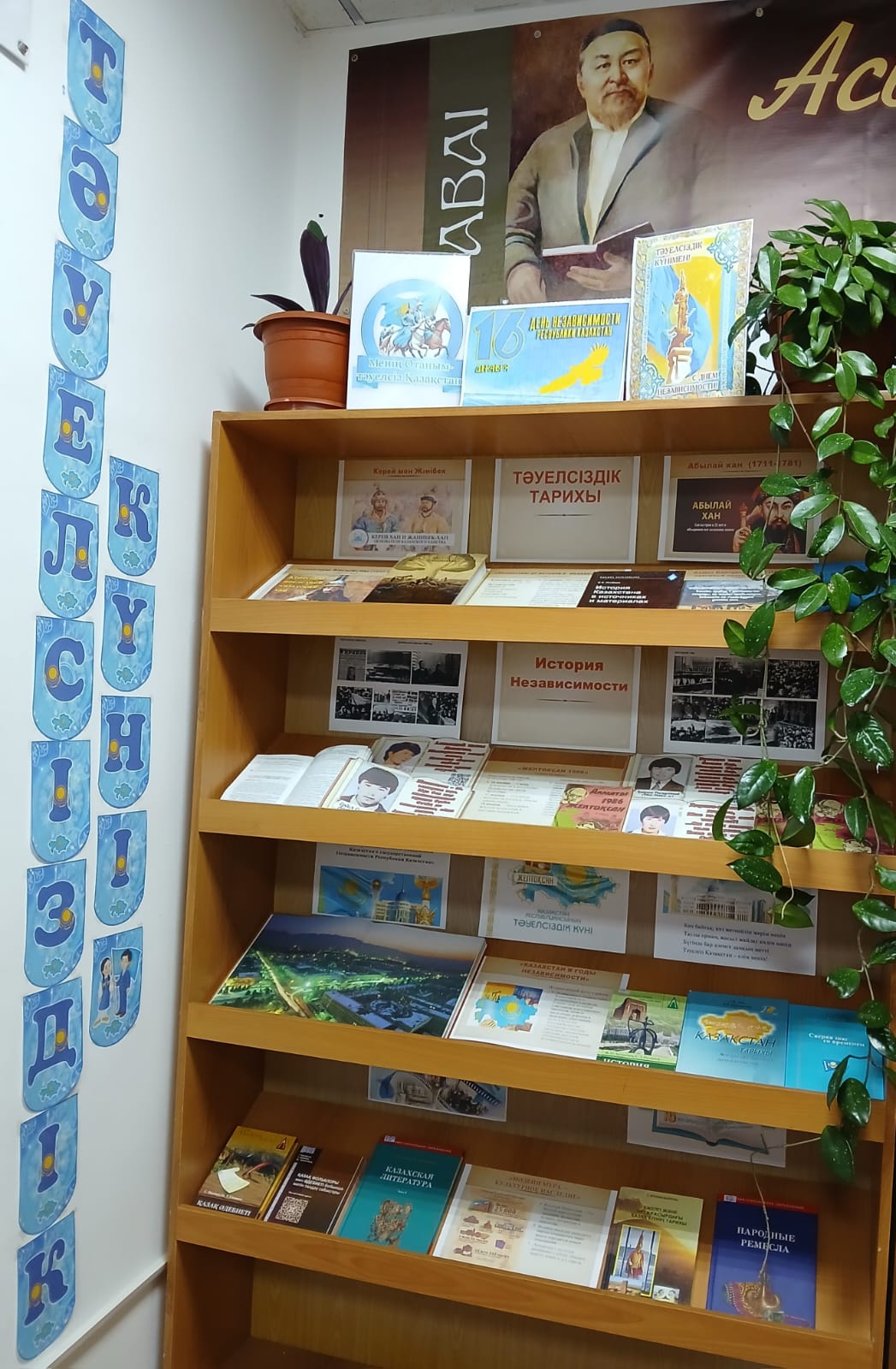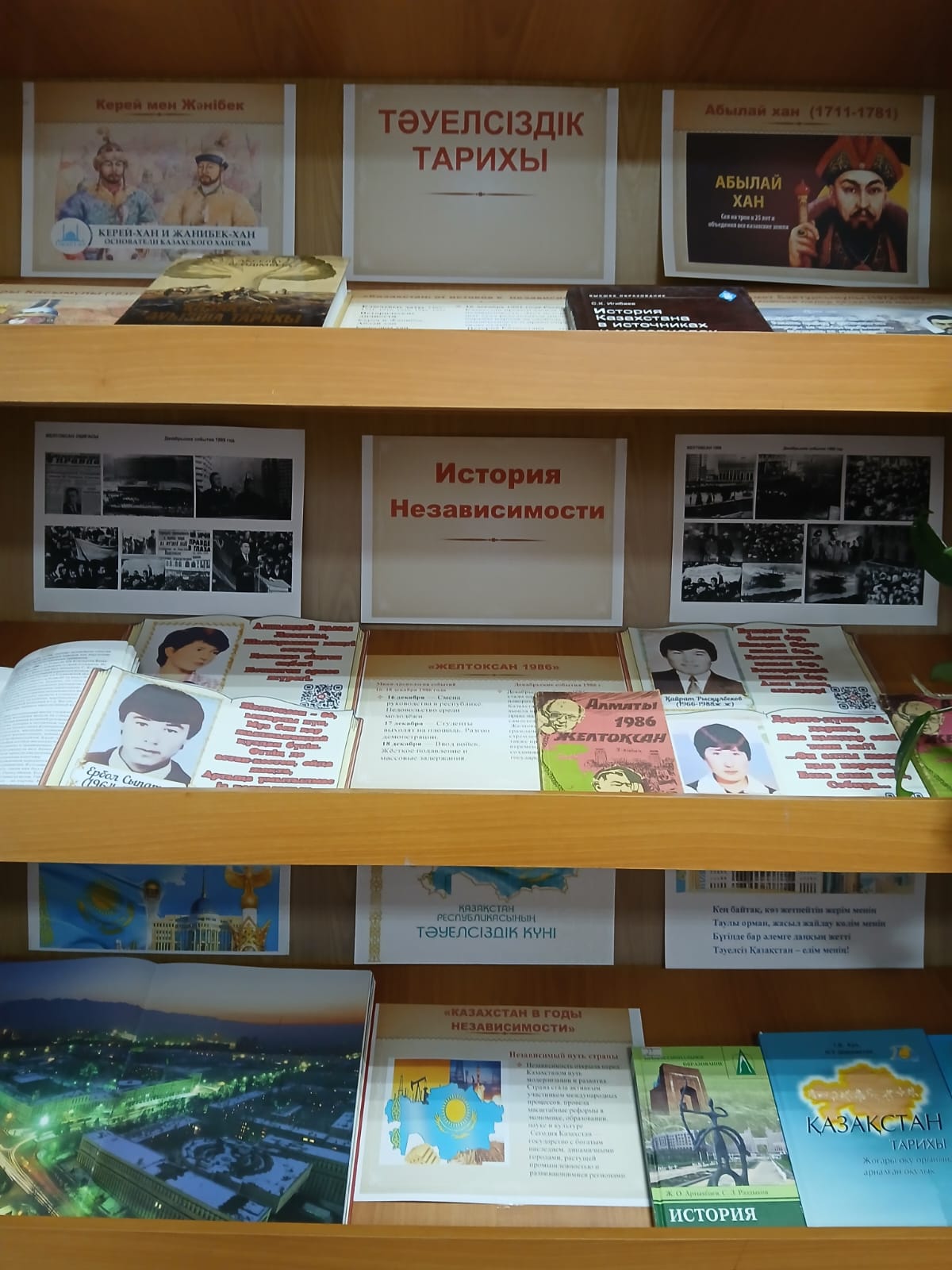 1. "Қазақстан: Тәуелсіздіктің бастауынан бастап" көрмесінің бөлімі қазақ халқының сан ғасырлық тарихын, мемлекеттіліктің қалыптасу процестерін, саяси және экономикалық жүйенің дамуын, елдің тәуелсіздігі мен дамуына үлес қосқан көрнекті қайраткерлер туралы басылымдарды қамтитын тарихшылардың еңбектерін ұсынады.