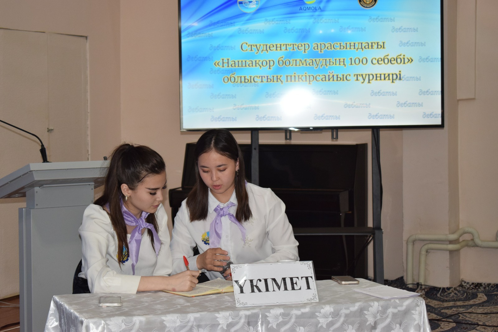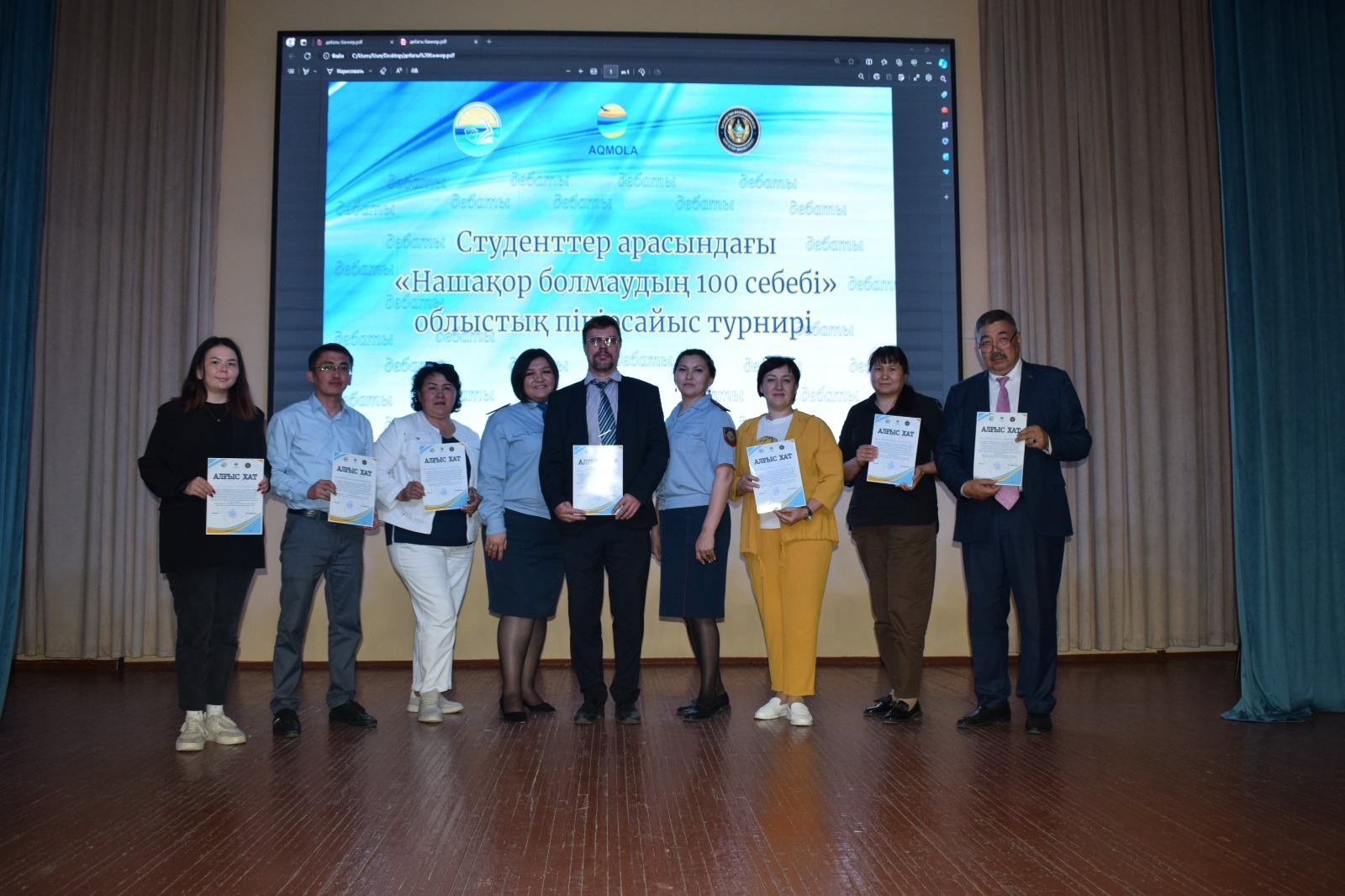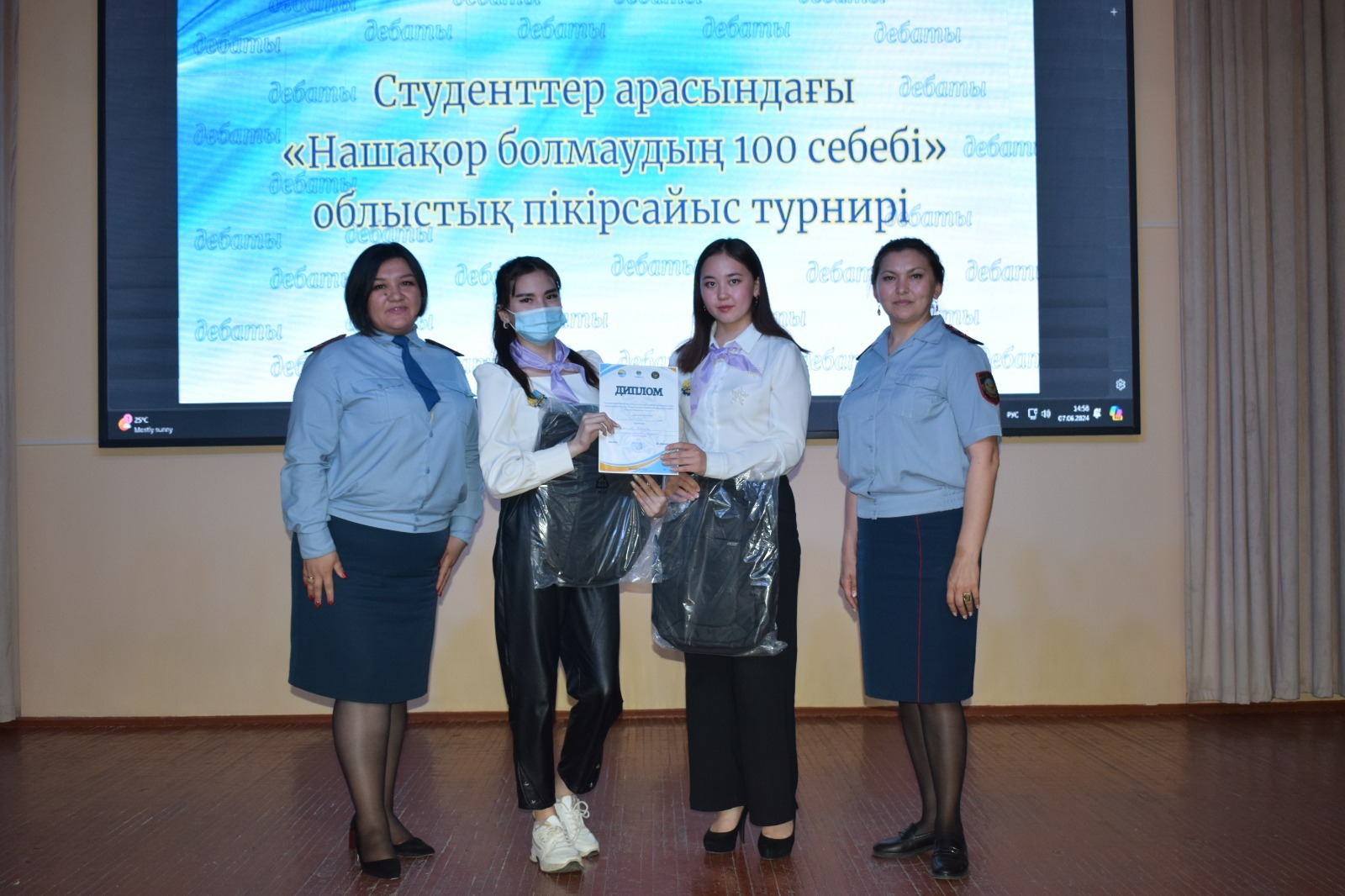 7 июня 2024 года Центром выявления одаренных детей и талантливой молодежи «Акмола дарыны» управления образования Акмолинской области совместно с управлением по противодействию наркопреступности Департамента полиции Акмолинской области был проведен областной дебатный турнир среди студентов посвященный Международному дню борьбы с наркоманией и незаконным оборотом наркотиков «100 причин не стать наркоманом». В турнире приняло участие 20 команд колледжей нашей области. На основании итогового решения судей команда казахской лиги «Camelot» (Бокенова Жанерке, Сармаганбетова Мадина, группа НО-31) дебатного клуба «Ұшқыр ой» Учреждения «Высший казахский гуманитарно-технический колледж» была определена победителями турнира. Спикеры награждены Дипломами первой степени и памятными подарками, руководитель Анисова Айгерим Сагындыковна отмечена благодарственным письмом управления образования Акмолинской области. Спикеры команды «Искра» (Даулбаева Алтынай, группа НО-21, Жаров Роман, группа НО-12) русской лиги награждены сертификатами за участие. |