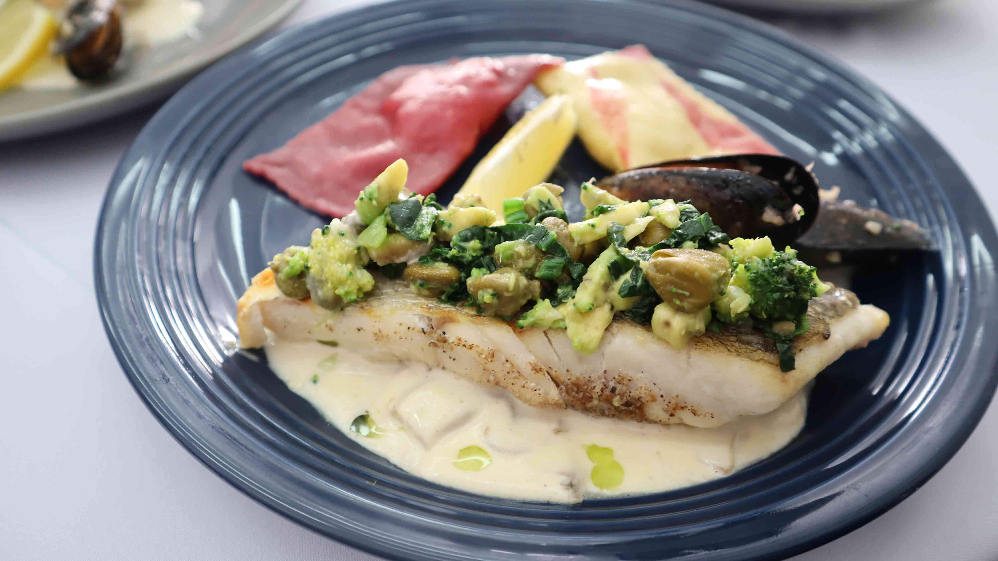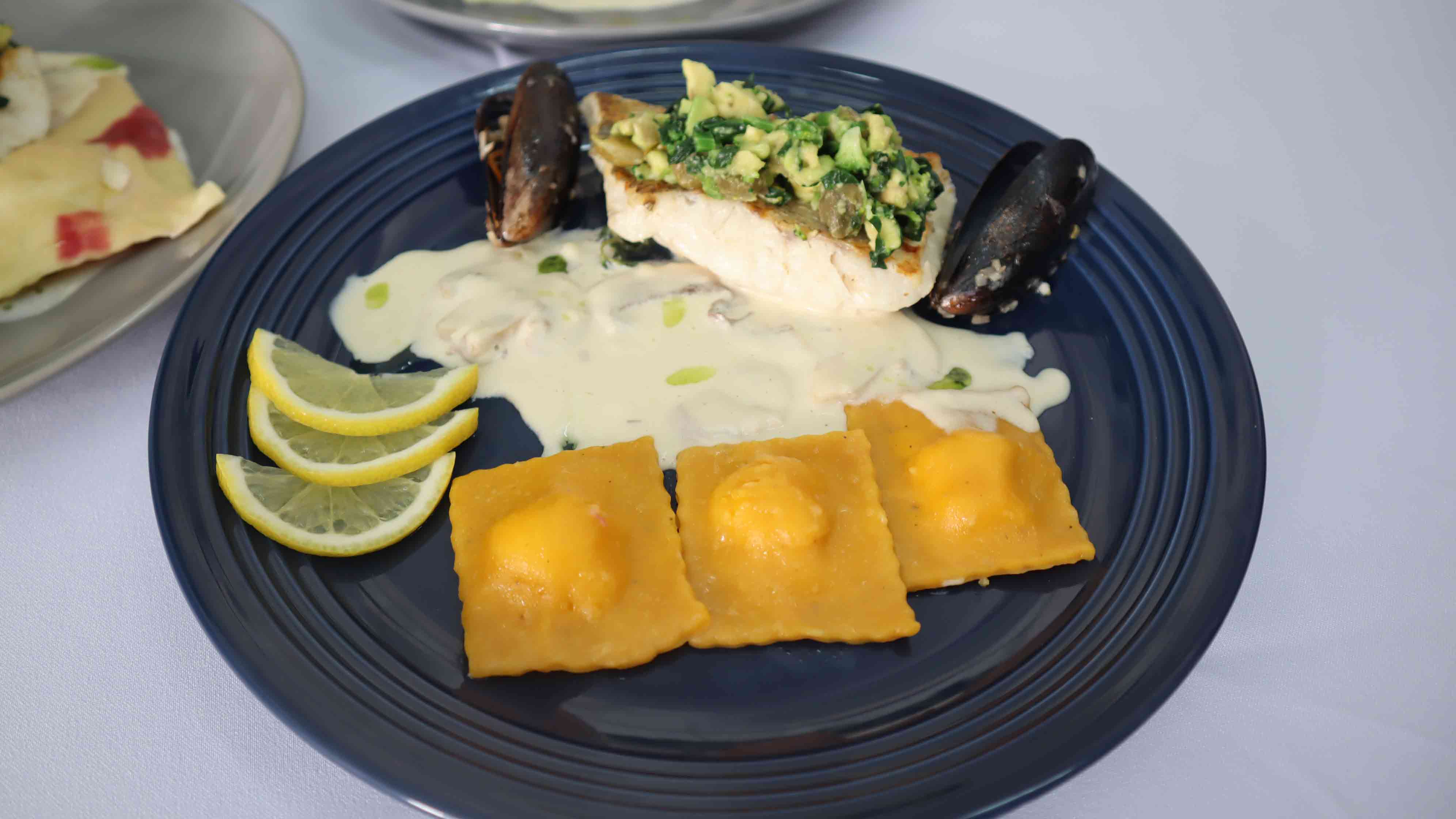 2. Горячее блюдо из рыбы с двумя гарнирами и соусом